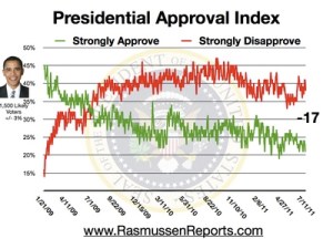Please note how is “strongly approve” just keeps dropping…hung around 30% for a while…then bounced back and forth around 25%…now its heading towards 20%…Keep it up, Barry…heckuva job you’re doing, there.