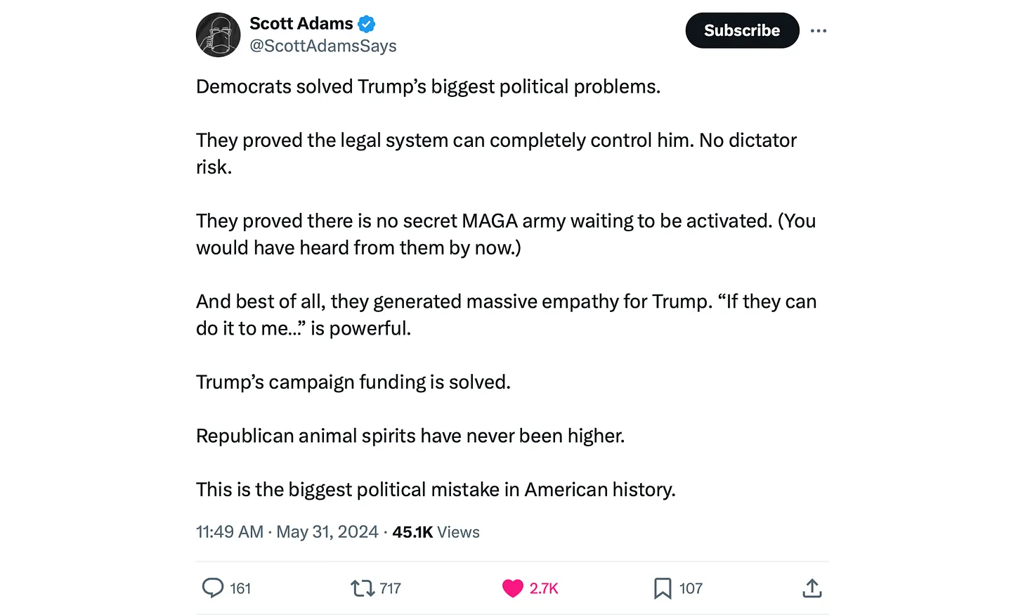 Actually, I look at yesterday’s verdict as a massive in-kind campaign donation to Trump. It doesn’t get much better than having your opponent fund your campaign.