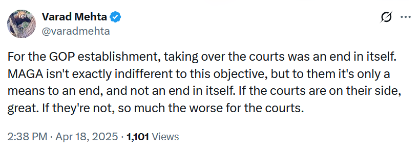 Varad Mehta over on X (@varadmehta – a definite must-follow) has been talking up MAGA’s disdain for and lack of patience with the Judicial Resistance to Trump II: