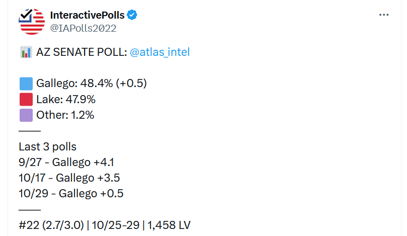 It is very much an outlier – everyone else shows Gallego comfortably ahead. But if it is like this, then a Trump win would drag Lake over the finish line. The trend line on it is interesting. And it is in line with the general thrust of polling which shows a shift to the GOP increasing over time.