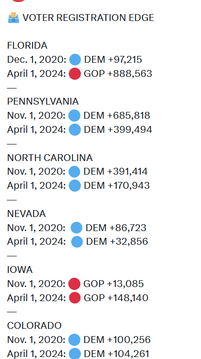 Now, why would I think that? They recently released a Maryland poll and, as you expected, it shows Biden winning the State in a blowout. The RCP average of polls shows Biden up by 23.5. Neither campaign will spend a dime in the State. It will be called for Biden as soon as the polls close; and they’ll make that call without even doing any exit polling. So, what am I up to here? What makes me think that the Maryland polling is good for Trump? Because Biden won the State by 32.9 points in 2020. See where I’m going? In deep Blue Maryland where the primary source of wealth is federal government employment…Biden is bleeding support. Not enough to cost him the State, but a lot. Now, how do you think that is translating into purple States? If the States won by Biden in 2020 just have a 3 point shift to Trump then NV, AZ, GA, PA, MI and WI flip and Trump is at 311. Just do the math in your head for what happens if the national shift is 5 points. Or 7 points. Or, like Maryland, 9.