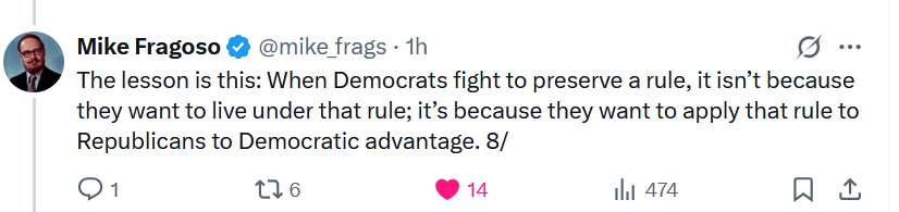 That is all “muh precious norms!” is about – simply trying to hamstring the GOP with rules the Democrats will ignore if they get into the majority. And the Never Trump guys are all on board with this – because they are now paid by the Democrats and their audience is almost exclusively Democrats. This particular bit is in relation to calls for the GOP Senate to ease rules so that Trump’s nominees can get confirmed – we are in September here and the Executive Branch still isn’t fully staffed with Trump’s people…meaning Deep State holdovers are still in charge of various things and are diligently working to undermine Trump. And that is why the Democrats and RINOs want to slow-walk the process…
